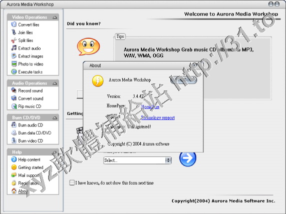 Aurora Media Workshop 是一款多媒體編輯軟體,包括了音頻,視頻和CD 3 種功能,可以轉換,